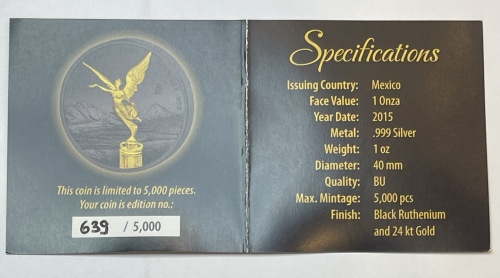 Серебряная монета "Либертад" 2015 год, в спец исполнении, Рутений, 31,1 г., Ag 999